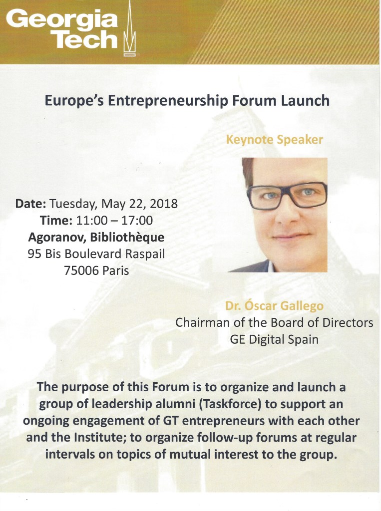 Georgia Tech Europe, 1st Entrepreneurship Forum, Digital in Manufacturing, Paris, Mayo 2018